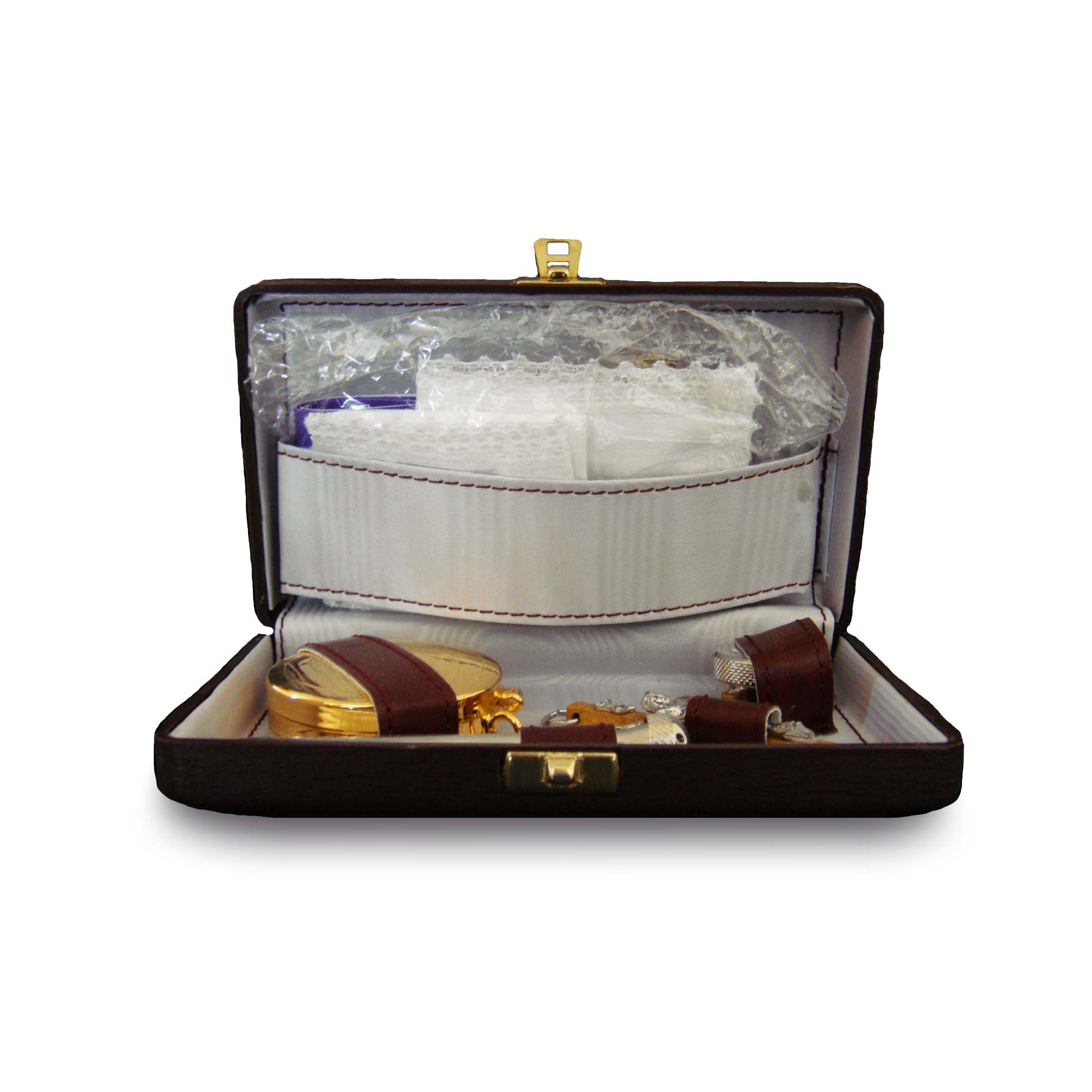 golden metal case, asperges and oil jar of the sick silver metal, with purificator, crucifix and small stole